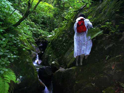 白山祭りの日は、白峰詣がここ数年恒例行事となっている。それに、尺サイズが出るジンクスもある。勿論2004年も大物をねらい、白峰に向かうことにした。今年は、渓遊会のメンバーに加えて山本氏も参加することになった。 7月17日 水谷、岡本組は、6時に水谷邸を出発。我々は、釣りにしては少し遅いが優雅に7時過ぎに京都を発った。天気予報では、夕方までなんとかもつようである。 11時過ぎに目的の下田原谷の枝谷に到着。今年、春先に入った谷である。しかし、周囲は夏草が生い茂り同じ谷とは思えない程である。釣り仕度を終え、12時前に出発。谷への下降路は、注意深く探さないと見過ごしてしまう程背丈を超す草にまぎれている。それでも、5分程で流れに立つことが出来た。 先ず、前回良型が出た落ち込みに仕掛けを流す。と、強烈なあたりがある。しかし、手応えはなく仕掛けは宙を切っただけであった。多分、イワナは目印に食いついたのであろ。その一つ上のポイントでは、山本氏が20cm級をヒットさせている。あまり時間も無いので、大場のみをさぐりながら進むことにする。水量は前回に比べして半減していて、イワナの食いは渋く釣り落とすことが多い。それでも、20cm級が4匹程魚籠に収まっている。勿論、20cm以下は放流である。 そうこうするうちに、分岐に至る。前回は水量の多い左俣を辿ったが、今回は右俣を探ることにした。水量は少ないが、イワナは意外と濃かった。しかし、型が小さく何度も放流を繰り返す。分岐から30分ほど釣り上がった処でようやく20cm級が出る。魚体をよく見ると、例の網傷が付いているいるではないか。やはり、この谷では違法な漁法がなされているようだ。 2時過ぎに、上空がにわかに暗くなり大粒の雨が落ちてくる。山本氏はカッパを付けるが、私はそのままで遡行を続ける。時折立ち止まり耳を澄ませば、足下では谷がリズミカルに瀬音を立て、耳元にはヒグラシの透明な鳴き声が染み入ってくる。 |