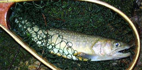 地図上でコンター580m当たりまでくると、谷はいよいよ狭くなり、困難ではないが両岸は岩場となる。ここまで来ると、イワナの型も大きくなり20cmを越えるようになる。胸まで漬かって尚も進むと再び分岐に至る。水量も随分と減り、もう源頭であることを告げているいるようである。山本氏は右俣を探り、私は左俣を探ることにした。いずれも200m程で谷は藪の中に消え去ってしまっている。 左俣最後の流れもない一寸したポイントに最後の一投を試みる。と、瞬間目印は岩陰に鋭く引き込まれる。同時に、少し強めに合わせると強烈な手応えが返って来る。大物だ!慎重にイワナを手前の岩場に引き揚げる。28cmの今日一番のイワナであった。 |