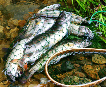 9月6日 下田原谷のヘアーピンカーブを描いている林道の小さな空き地に車を止めることにした。今日の同行者は、山本氏である。今月末学会のため日本を離れる彼にとっては、今シーズン最後の渓流である。 今日は、林道から下田原谷へ下降しそのまま上流に釣り上がる予定なのだ。早めの昼食後、降り立った谷は何時もより増水し、笹濁っている。これは「つるの」の女将が云う通り、大釣りが出来るかも知れない。期待は次第に膨らで行くのであった。河原を見ると、最近大水があったのであろう、全ての草がなぎ倒されている。 いよいよ、第一投だ。仕掛けは、リズミカルに白く波立った瀬を這うように流れて行く。これぞナチュラルドリフトと、自画自賛。もう一度同じポイントに流すと、コツコツと神経質なあたり。素速く合わすと、岩魚ではない鋭い引きが帰ってくる。ヤマメに違いない。引き上げると、やはり幅広のパーマークも色鮮やかなヤマメであった。上流の山本氏も竿を撓らせている。 その後ヤマメ達は、瀬からも淵からも面白いように飛び出してくる。もう、入れ食い状態である。ナチュラルドリフトもあったものではない。僕たちは、夢中にになって仕掛けを流し続けた。気が付けば、魚籠は重くなっていた。もうこれ以上釣っても食べ切れない、それ以降は全て放流することにした。相変わらずヤマメ達は、次々と仕掛けに飛びつて来る。 近くの岩に腰を落とし周囲を見渡すと、オタカラコウが大きな花で水辺を飾っている。アキギリ、サラシナショウマもあちこちで渓を彩っている。もうしばらくすると、大文字草も花を開けるにちがいない。渓を吹き抜ける風は、もう乾いた秋のそれであった。全身で山の霊気を吸い込み、僕は再び立ち上がった。 そして、今日最後のとっておきのポイントに入ることにした。そこは、僕が15年以上隠し続けている岩魚のポイントなのだ。今日は山本氏に託し、僕はネットだけを持ち上流に向かう。先ず一つ目のポイント。瀬尻には、でかい岩魚が悠然として瀬に身を任せている。落ち込みに仕掛けを落とすと、岩魚はすーっと上流に消えていった。そして、強烈な引き。岩魚独特の、何時までも続く重い引きである。素速くネットを持ち上流に向かう。岩魚は、左右に走りなかなか取り込めない。数度掬い損なったが、無事ネットに収めることができる。丸々と太った27cmの惚れ惚れするほどの美しい魚体であった。 次のポイントでも、20cmの岩魚が出る。さらに上流の二つほどのポイントでは何事も起きず、とうとう最後のポイントだ。でかいヤツの気配がある。一投目で、目印は上流に引き込まれていった。その後、岩魚の重い引きが続く。慎重にすくい上げると、先の岩魚に勝るとも劣らない見事な岩魚であった。 さらに、上流に向かうがもう何も起こることはなかった。さー、引き上げよう。時計は、とっくに4時を回っている。道具を仕舞い、僕たちは急いだ。車に戻り、乾いた喉を潤した。そして、今日の宿「つるの」に向かったのであった。 「つるの」の夕食は何時ものように、山海の料理であふれている。加えて、釣った岩魚の塩焼き、骨酒だ。とても、食べきれない。今日も、女将にお詫びを云わなければならいようだ。 食後白峰の村を散策、酒屋により主人お奨めの地酒を1本買い込む。宿にに戻り、いつもの部屋へ入り布団にに身を横たえる。少し火照った体と、骨酒が浸みた体には、柔らかな布団は天国そのものであった。布団に潜り込むと、意識は驚く速さで失われて行った。 今回、携帯用のカメラを忘れたので現場での写真はありません。 |