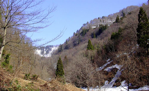白峰漁協の今年の解禁日は3月26日である。だが、定宿である「つるの」に電話すると、今年は近年にない大雪で残雪が多くて何も出来ないとのこと。いともあっさりと、断られる。 と云う訳で、4月16−17が今年初の釣行となった。 4月16日 京都8時過ぎに発つと、4時間弱で白峰に着くことが出来る。先ずは、「つるの」に立ち寄り遊魚券を購入。女将さんとは半年ぶりの再会である。20分ほど雑談を交わし、昼食のためまだ雪の残る緑の村へ向かう。思い思いの場所に陣取り、思い思いのコンビニ弁当を開ける。釣り仲間との楽しい一時である。 そして、いよいよ釣り仕度だ。さーて、これから何処に行こうか。この時期は林道は残雪に被われ、入れる箇所は限られる。思案の末、水谷、岡本組は大道谷に、山本さんと私は、百合谷に入ることにした。 林道のちょっとした駐車スペースに車を置き、雪の残る斜面を下降し釣りの開始である。何十年も渓流釣りを続けていても、シーズン始めの第一投は心躍るものだ。何時も25cm級のイワナが出るポイントに慎重に仕掛けを流す。だが、目印は何事も無く流れ下るだけであった。10回ほど流すも、何事も起こらずその場を離れ上流に向かうことにした。流れは雪解で増水し、通常より倍以上の勢いでである。飛び散る飛沫が、明るい光線を受けてガラスのかけらのように煌めいている。上流では山本氏が流れに向かって仕掛けを投じている。 その後、交互に釣り上がるも当たりはは皆無であった。雪面には、真新しい足跡残されている。午前中に、先行者があったのかもしれない。とりあえず、斜面を林道まで登り返し、上流向かうことにした。 仰げば、一片の雲もない蒼空が拡がっている。「これが、蒼空と云うものです。」と云わんばかりに誇らしげである。斜面に視線を向けると、むら消えの雪を抱えた雑木林が芽吹き始めている。淡い萌黄色は例えるすべもないほど美しい。耳を澄ませば、ソプラノのミソサザエがリズミカルな旋律を山間に響かせている。横には、気のあった友がいる。少し火照った頬には、まだまだ冷たい風が吹き向けて行く。長閑んで、心豊かな一時である。 |