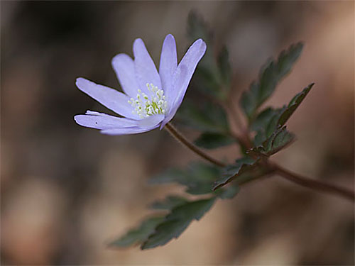 再度斜面を下降し釣りを試みるが、一つの当たりもない。最後にとっておきのポイントで試みるも、仕掛けは空を切るのみであった。時計を見ると4時を少しまわっている。今日はこれまでと、帰路につくことにした。 雪が消えた斜面を凝視すると、青いキクザケイチゲが群生していた。可憐で清楚な花である。今日は、この花に会えたことで満足としよう。そんなことを思いながら、林道を引き返して行くのであった。 |