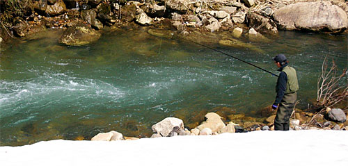 4月17日 窓を開け空を見ると、今日も昨日に負けない程の晴天を約束してくれている。だがここは雪深い白峰村、布団から抜け出るとまだまだ寒さが身にしみてくる。朝食前に、一人宿を抜け白山の撮影に西山に向かう。しかし、御天道様はとっくに上がり、見事な逆光で白山を照らしておられた。撮影は諦め、宿に戻るともう朝食の用意は出来ていた。 ボリューム満点の朝食である。それでも、ご飯をおかわりし満腹となる。そして部屋へ戻り、今日の準備に取りかかる。昨日の釣りで少ししめったズボンとシャツに履き替え、冷たい靴下を履けば完了である。最後に、女将さんに別れの挨拶をし宿を後にする。 水谷、岡本組は本流へ、山本、川北組は大道谷へ入ることにする。だが、私は山本氏のお抱え撮影係になるつもりである。カメラを首にさげ彼の後を追う。大道谷も、雪解け水で増水している。 |