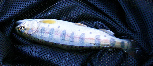 選りながら上流へと釣り進む。30分程でここはと云う絶好の場所に出会う。仕掛けを数回流すと、15cm鮮やか色合いのヤマメが掛かる。もう、さびは完全にとれ惚れ惚れとする美しい魚体である。弱らないよう素速く放てば、元気よく元の流れに戻っていったのである。同じ場所でもう一度仕掛けを流すと、先ほどよりひとまわり大きいヤマメが、掛かる。尚も、上流に釣り進むと、大きく竿先が撓る。20cm程度のイワナであった。今年始めてのイワナに、山本氏は大喜びである。 流れは、陽の光を受けてキラキラと輝いている。両岸には、銀白色から淡い黄緑に変身したネコヤナギが風に揺らいでいる。柳絮を飛ばす日が近づいているようだ。 |