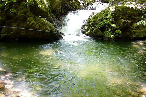 5月21日 林道の横に車を止め、釣り支度を終えたのがもう昼前であった。渓流釣りにすれば随分と遅い時刻である。でも、僕たちは急ぎはしない。美しい花々を楽しみ、清冽な渓を辿り、雑木の溢れる程の緑を浴び、そして運が良ければ渓の宝石である渓魚に巡り会えれば充分なのだ。 今日入る渓は下田原の支流で、過去に二度辿った事がある。その時の同行者は何れも山本氏である。林道から外れ、渓に向かって下降を開始するとキバナノイカリソウが足下とで歓迎してくれる。その横ではニリンソウの群落が風に揺られている。期待していたキクザキイチゲは、すでに花期を終えたようである。花を楽しみながら10分ほどでで流れに辿り着く。美しく、透明な流れは、周囲の山肌に心地良い瀬音を響かせながらせせらいででいる。 仕掛けを穂先に付けると、釣りの開始である。仕掛けは、美しい曲線を描きながら流れ下っていく。が、反応はは無く、目印はぴくりともしない。以前もそうであったが、この渓は、下流部ににはイワナはいないようである。それでも釣り人の性か、イワナが潜んでいそうなポイントがあればつい竿を出してしまう。視線を流れから解放し、足下に移せばラショウモンカズラが大ぶりの花を溢れんばかりに付けている。しかも、中には、ピンク色の花もある。花の多い渓だ。 いくつもの滝を越えながら上流に進めば、この渓最大の淵が待ちかまえているのである。 この淵では、何時も良形のイワナが出る。先行していた山本氏が既に一尾取り込んでいた。 私が追いついた時には二尾目を掛けて、奮闘中であった。しかし、取り込む前に糸が切れてしまう。一尾目より大きそうとのことであった。再度仕掛けを流すも、イワナは現れてこなかった。 |