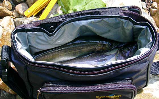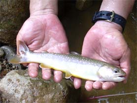 | 元の道を少し引き返し、ツルツルの斜面を立木に頼って堰堤を越えればすぐに一級のポイントが待っている。ザックを置き見事な流れを前にして贅沢な休憩をとる。そして、一級ポイントへ。水谷さんの二投目、グゥッグゥッと竿がしなる。尺物か!。流れに入り網ですくえば、準尺ものであった。ザックを置いたまま空身で釣り上がる。広い河原小石が累々と積み重なっている。イワナ達は、人間のつたない推測では予測出来ない場所に潜んでいる。思いがけない流れや、小さなたまりから飛び出てくる。やがて、底まで透いて見える澄み渡った大きな淵が現れる。イワナが底で泳ぐのが見える。人の影など見たことがないのだろうか、仕掛けを流すと難なく飛びついてくる。魚籠を覗くとイワナでいっぱいである。今日はこれで充分だ。さー帰えろう、僕たちは立ち上がり上流に背を向ける。見上げると谷間にはいつの間にか晴れ上がった青い空が拡がっていた。 |