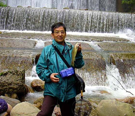 | そ後、水谷さんのお供で渓をそのまま下ることにする。20cm弱のイワナ二尾を魚籠に収め、堰堤下まで引き返すことにする。次は1mほどの堰堤を越え大堰堤の間の幅広い淵を釣ることにした。幅が広くてポイントが分かりづらい場所である。水谷さんは、位置を変えながら仕掛けを堰堤の落ち込みに向かって何度も投げ入れる。そして、数分後竿がしなる。急いで網ですくえば20cm強イワナであった。その後も水谷さんは、仕掛けを投げ続ける。僕は、先ほどから一つのポイントが気に掛かっていた。流れが渦を巻いて淀んでいる小さな場所である。まさか思いながら、腰から竿を抜きそのポイントに仕掛けを流すと目印がとまった。底にでも掛かったと思い竿を立てると突然穂先が水面に吸い込まれる様な強烈な引きが右手に伝わってくる。先ほどの引き以上だ。まず取り込む場所を探し、竿を横ざまにイワナを誘導。これまた尺サイズの大物であった。水谷さんがすかさず同じポイントに仕掛けを流すと、20cm強のイワナが飛びついてくる。もう少し長い竿が有れば40cm級も望めそうな場所であるが、今日はこれまでとその場を離れ大堰堤の上部へ向かうことにした。 |