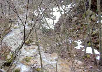 3月17日 2月の下旬に1時間程探った谷が気になっていた。3月17日天気も良く暖かな日なので、本格的に辿ることにした。車で1時間半程度で目指す八王子川に到着。3月も半ばを過ぎたとはいえここは雪深い湖北山地、車窓より望む山々の稜線はまだまだ豊かな白い残雪に被われている。 ![]() 残雪をまとった湖北の山々 10時を少し過ぎた頃身支度を終え、入山の開始だ。ただ今日は、谷の最下部をショートカットする予定だ。辿る斜面に早くも残雪が現れる。その残雪にはつい数日前に入渓者があった事を示すくっきりとした足跡がある。もう一週間早く来れば良かったと悔いつつも計画通りに足を進める。周囲の木々の芽は固くまだ春はまだまだ先のようでである。15分程で目的の入渓地点に達する。 ザックを下ろし竿に仕掛けを取り付け、いよいよ入渓の開始だ。流れに一歩足を踏み入れると、雪解け水の冷たい感触が、ウェーダーを通して伝わってくる。第一投は、小さな落ち込みの捩れ場である。2度流しても何も起こらない。例の入渓者がザラメの雪に点々と残した足跡を伝いながら釣り上がっていく。30分程で10cm級の岩魚が竿を三回ほど揺らすが、これといった当たりはない。見覚えのある堰堤を二つ越えた処で20cmの岩魚がようやく本格的に竿を撓らせる。河床が花崗岩なので白っぽい美しい魚体だ。写真に収めすばやく放流する。 ![]() 雪の残る早春の谷 それ以降も、ちび岩魚がちょかいを出すだけで何事も起こらない。幾つもの堰堤を越えると、目の前に見覚えのない高い堰堤が現れる。この谷をここまで詰めるのは十数年ぶりなので、それ以降に建設されたのであろう。堰堤手前の流れの溜まりに仕掛けを流すと目印が止まった。軽く合わせると、意外に強い引きが手元に伝わってくる。ネットですくうと25cmの今日一番の岩魚だ。さすがにここまで来ると、まだ少しさびが残っている。横の浅瀬に誘導しこれも素速く写真に収め放流する。岩魚は、元気よく元の流れに戻っていった。 ![]() まだ、さびの残るイワナ 時計を見ると、針は2時を回っている。今日は先の堰堤までと決め、竿だけを持ち堰堤下まで行くことにした。期待した堰堤では、ちび岩魚がこつこつと竿先を揺らすのみであった。 荷物を残した場所に戻り、紅茶と、サンドイッチの遅い昼食を楽しんだ。谷間から見上げる空は、果てを知らぬか様に高く、そして透明で蒼い。若い時ならばさらに堰堤を越え時間ぎりぎりまで谷を詰めたに違いないが、今はこれで充分だ。次回は、気のあった仲間とこの先を釣り上がろう。そう決めて、堰堤工事のために作られた、今は朽ち果てた林道跡を辿って谷に別れを告げたのであった。 |